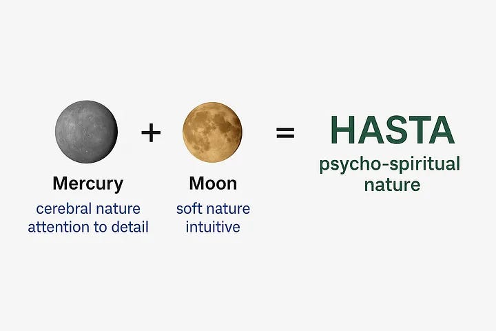 Together, Mercury and the Moon create a blend of sharp intellect and gentle perception. There’s both structure and softness, a balance of analysis and empathy. People with strong Hasta influence often move through life with quiet attentiveness — noticing details others miss and adjusting with fluid intelligence, grounded in both head and heart.