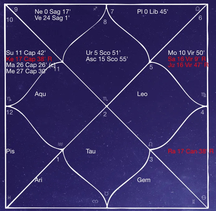 Jupiter, as the ruler of the 5th house of creativity, and Saturn, ruling the 3rd house of communication, are both closely conjunct the Moon in the 11th house in Hasta. This alignment suggests a natural fluency in translating abstract or intuitive ideas into structured, creative expression. There’s a refined intelligence here — someone who may channel philosophical insight or emotional depth into communicative forms such as writing, music, or design. Their talents likely emerge through a patient, methodical process rather than sudden bursts, reflecting the earthy precision of Virgo and the craft-driven nature of Hasta.