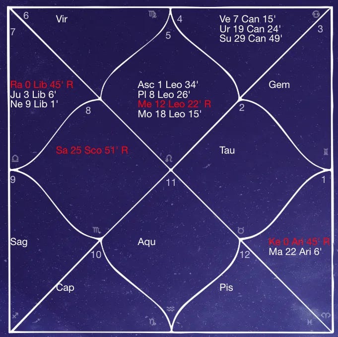 This chart has a Leo Ascendant with the Moon, Mercury, and Pluto placed in Leo in the 1st house. The following key observations can be made about this chart: