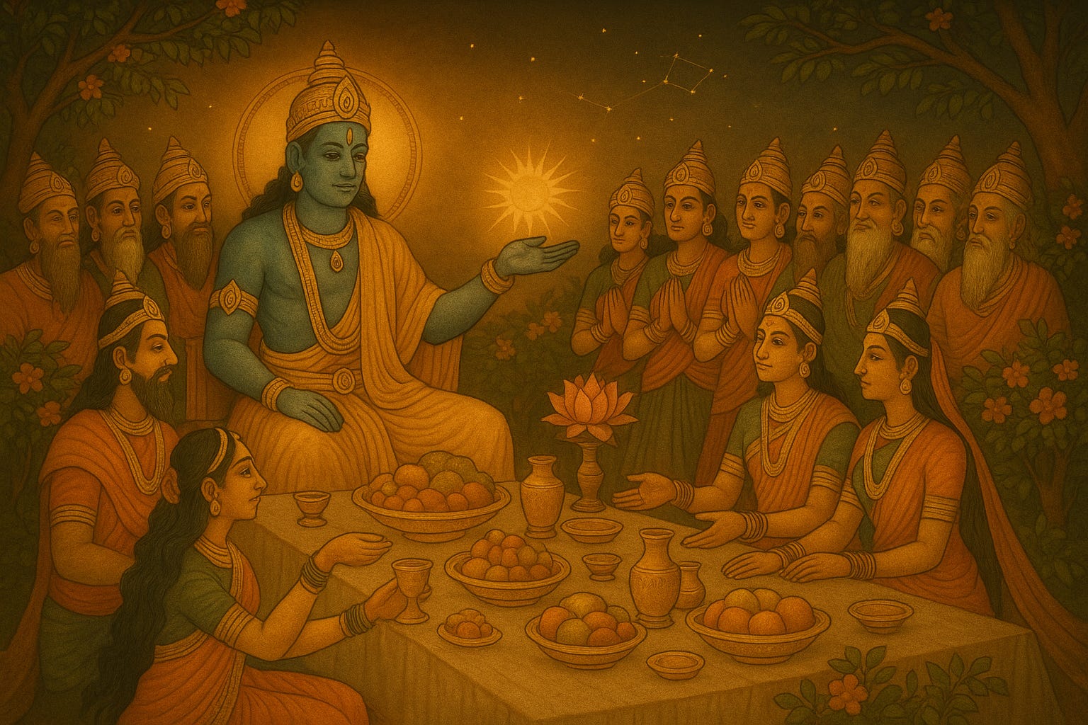 Another myth recounts Bhaga presiding over a divine feast meant to celebrate abundance and unity. When discord arises and threatens the gathering, Bhaga remains steadfast in his duty, symbolizing the importance of balance, inclusion, and the celebration of life’s blessings despite challenges.