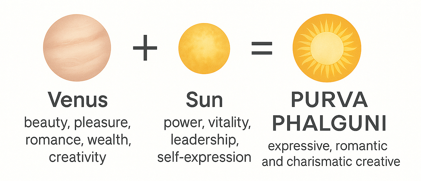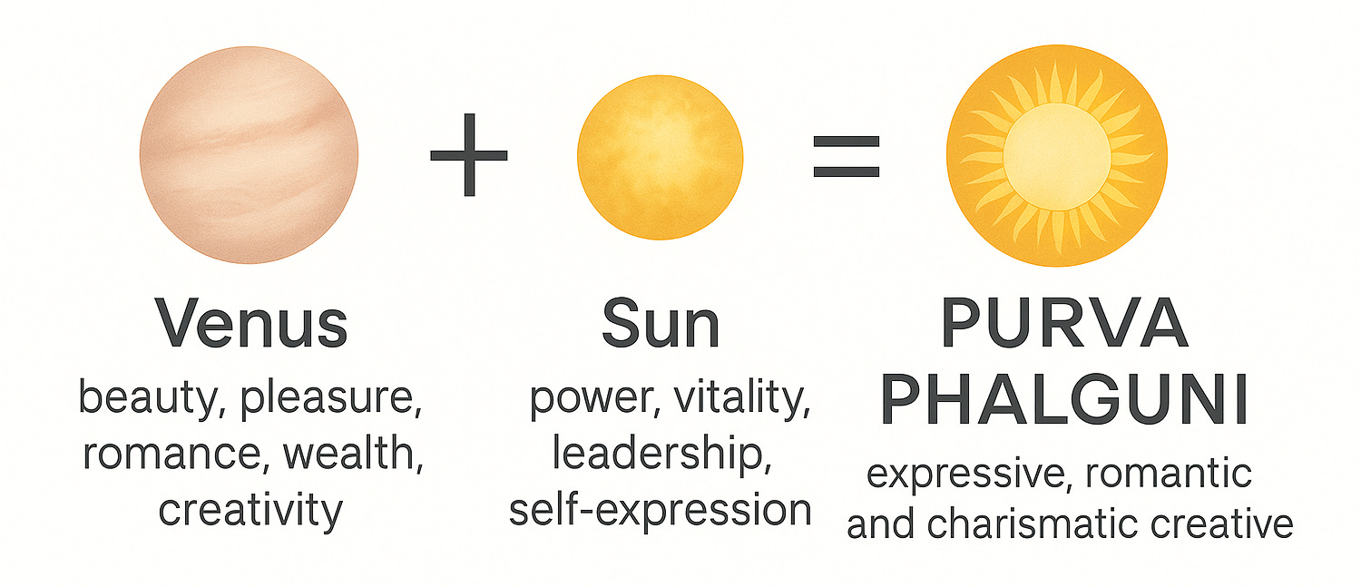 Leo, where Purva Phalguni resides, is ruled by the Sun. The Sun represents power, vitality, leadership, and self-expression.
