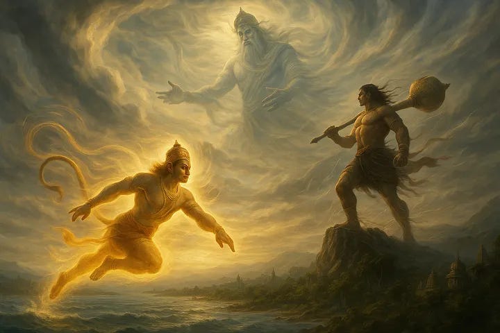 Vayu’s mythology is deeply woven into the epic narratives of the Mahabharata and Ramayana. He is the divine father of Hanuman, the monkey god known for his supernatural strength, boundless devotion, and unwavering service to Lord Rama. Hanuman’s leap across the ocean to reach Sita and his ability to grow or shrink in size capture the supernatural potential of the wind. Similarly, Vayu fathers Bhima, the mighty Pandava warrior whose immense physical power and appetite are legendary. Both sons embody facets of Vayu: Hanuman as the refined, devotional aspect of air; Bhima as its raw, forceful expression. Those born under Swati carry energies of both — capable of fierce loyalty and powerful action, yet always seeking freedom and movement.