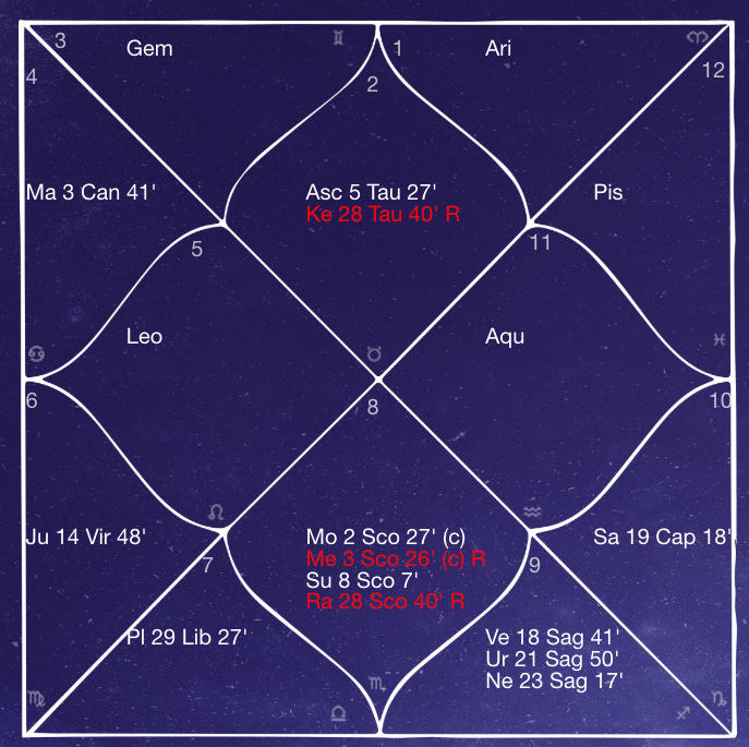 Has an emotionally intense and transformation-driven nature (Moon in Vishaka in Scorpio).