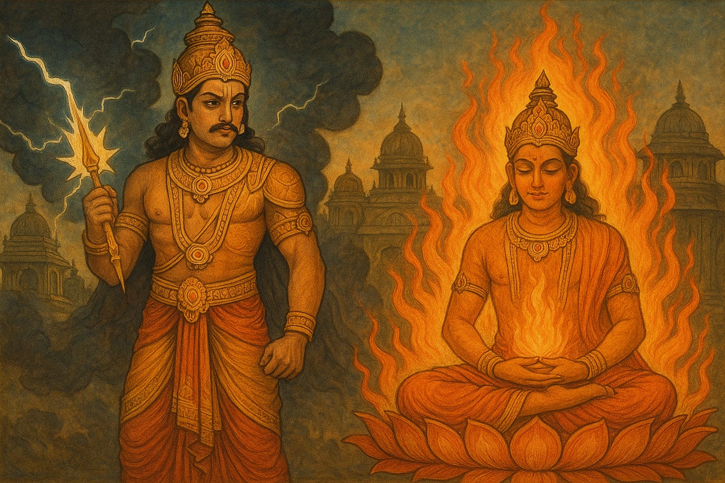 Indra and Agni often appear together in Rig Vedic hymns, leading divine battles and restoring cosmic order. As a pair, they represent the dynamic dance of thunder and flame - the force that clears the path and the fire that energizes it.