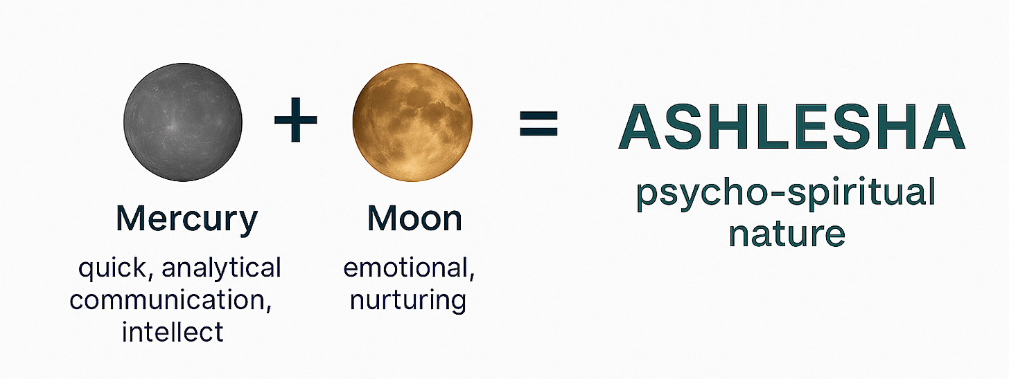 Nakshatra Ruler — Ashlesha is ruled by the planet Mercury. Mercury’s energy is quick, analytical, and deeply connected to communication and intellect. Mercury gives Ashlesha people a sharp mind, adaptability, and the ability to understand subtle details. It also brings the potential for persuasion, cleverness, and sometimes manipulation when necessary. When this energy combines with Ashlesha’s secretive and transformative qualities, it results in a person who can easily navigate complex emotional and intellectual terrains.