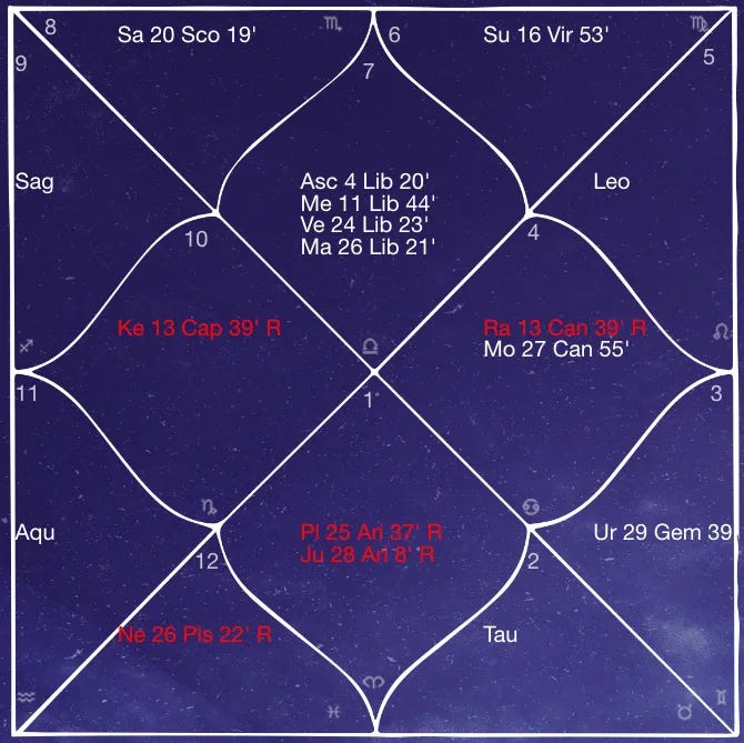 This is an example of a chart with the Moon in Ashlesha Nakshatra, in Cancer, placed in the 10th house, along with Rahu (north node).